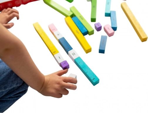 Cijfers en rekenkundige symbolen op houten stukjes helpen kinderen eenvoudige sommen te leggen en wiskunde op een natuurlijke manier te begrijpen.