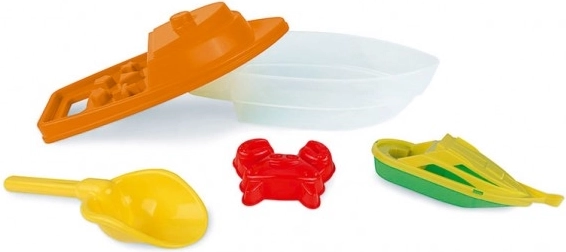 Deze kleurrijke plastic boot is een essentieel accessoire voor elk kind dat graag op het strand speelt. De set bevat ook verschillende vormpjes en bakjes waarmee in zand en water kan worden gespeeld.