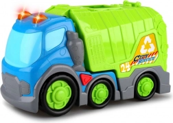 Ontdek de vuilniswagen van 31 cm die kinderen veel actie en fantasie biedt. Het speelgoed combineert realistische licht- en geluidseffecten met eenvoudige bediening – de effecten worden geactiveerd met de knop op het dak van de cabine. Vrijloopwielen zorgen voor een soepele beweging over de vloer en eenvoudig sturen, zelfs voor de kleintjes.