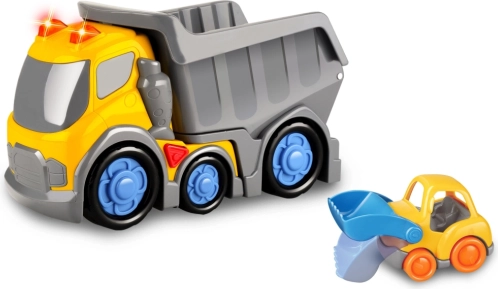 De leuke Kiddy Go!-set bevat een robuust vrachtauto van 31 cm en een klein autootje voor nóg meer speelplezier. Het voertuig biedt licht- en geluidseffecten geactiveerd door een knop op het dak, een kiepbare laadbak en vrijloopwielen. 2× AA-batterijen zijn inbegrepen. Geschikt vanaf 18 maanden.