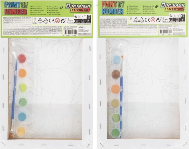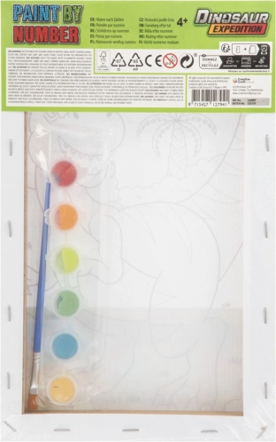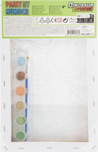 Schilderen op nummer dinosaurussen, creatieve set voor kinderen met canvas, 6 kleuren en penseel.
