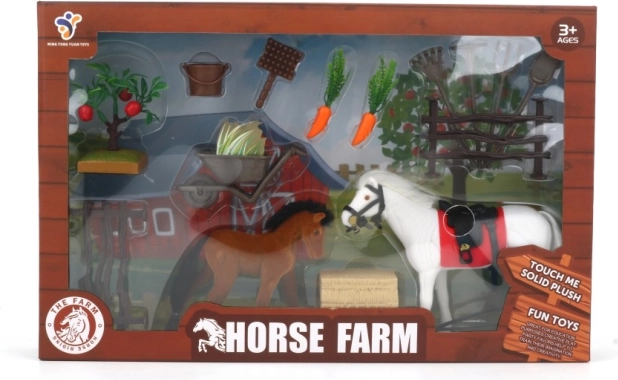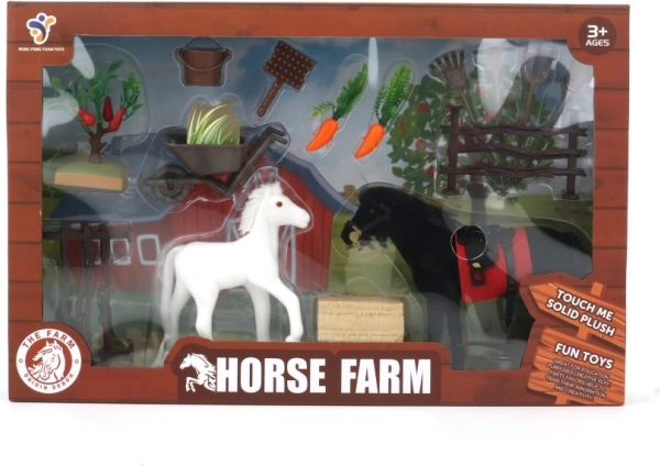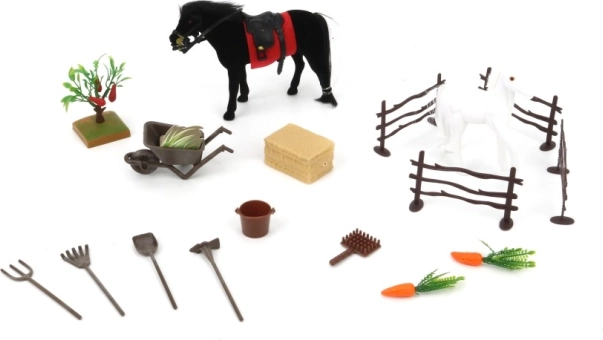 De set bevat alles wat je nodig hebt om je eigen paardenboerderij te creëren, inclusief paardenfiguren, boerderijinstrumenten en groenten.