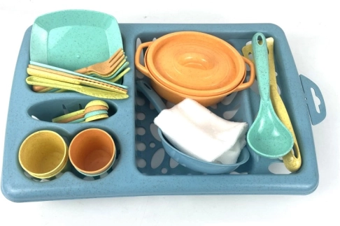Ecologische 27‑delige serviesset van tarwemateriaal is ideaal voor kinderen die graag koken en tafelen. Een veilige keuze voor het milieu en de ontwikkeling van kindercreativiteit.