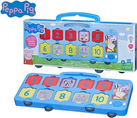 Ontdek een leuke manier om te leren tellen met het favoriete personage Peppa Pig. De kleurrijke bus 1–2–3 heeft draaibare raampjes met aan de ene kant een nummer en aan de andere kant het overeenkomende aantal objecten. Een praktische handgreep maakt dragen gemakkelijk, zodat kinderen het speelgoed overal mee naartoe kunnen nemen en spelenderwijs tellen, de fijne motoriek en het geheugen kunnen ontwikkelen.