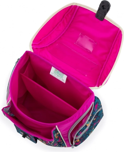 De slimme interne indeling met verdeler, de ruime hoofdsectie en de vele vakken houden schoolspullen overzichtelijk op hun plek. De eenvoudige magnetische sluiting vergemakkelijkt dagelijks gebruik. De set wordt aangevuld met een praktische gymzak/turnzak met koordsluiting en een eenlaagse etui met twee kleppen (zonder vulling) met elastische lussen en een transparant venster voor het lesrooster.