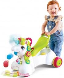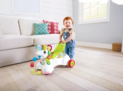 De zitting kan eenvoudig worden opgeklapt voor de loopmodus en neergeklapt voor het rijden; onder de zitting en aan de voorkant is ruimte voor balletjes. De eenhoorn kan rondslingerende balletjes verzamelen en deze uitwerpen op de vloer of in het mandje. De achterwielen hebben 2 snelheidsinstellingen voor beginnende en meer gevorderde lopers. De zachte hoorn licht op bij aanraking, wat kinderen motiveert tot interactie en ontdekken.