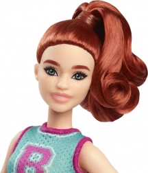 De gepresenteerde Barbie pop heeft rossig haar in een zijstaart en inspireert met haar sportieve-frisse outfit tot het verkennen van modetrends. Ze draagt een turquoise top met een grote 'B' en een schattige paarse geplooide rok, die wordt aangevuld met witte sneakers en een roze armband.