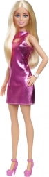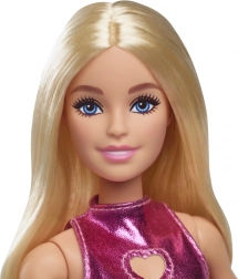 De Barbie Pop heeft lang blond haar en draagt een roze jurk, die opvallend en schattig is door het metallic materiaal en het hartvormige decolleté.