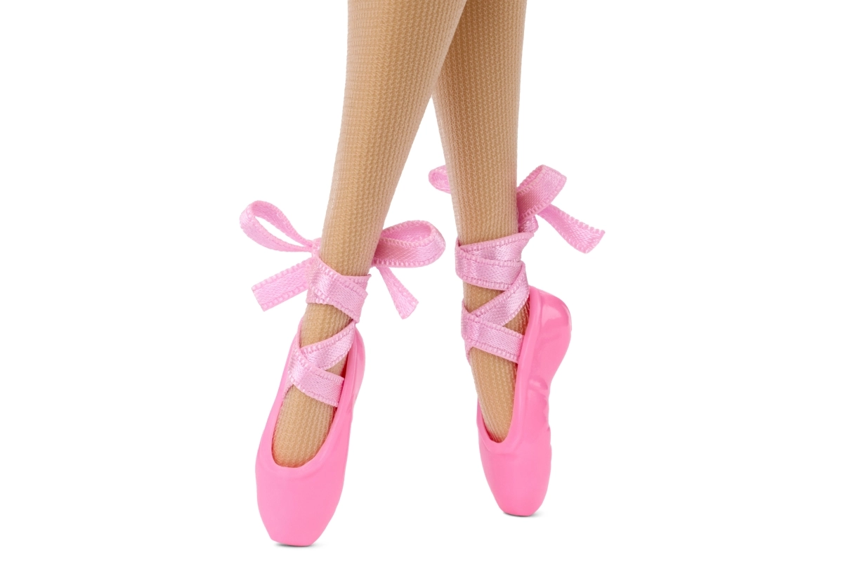 Roze balletschoentjes met sierlinten blijven stevig aan de voet van de pop zitten en maken de balletlook tot in het kleinste detail af.