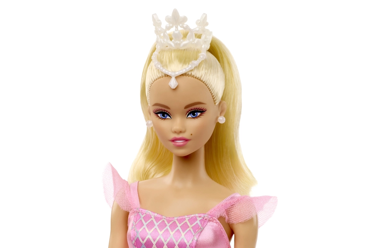 Roze satijnen tutu met transparante ruches, versierd lijfje en een witte tiara geven de pop echte podiumallure – ideaal voor grote premières én om tentoon te stellen.