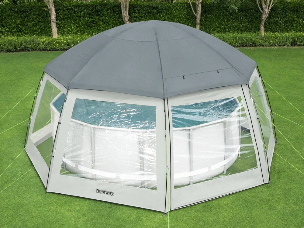 Het praktische BESTWAY 2-in-1 paviljoen verandert je tuin in een oase van rust – het dient zowel als afdekking voor opzetzwembaden als tuinpaviljoen. Dankzij de slijtvaste polyesterstof met coating is het waterdicht, beschermt het tegen zon (UPF 50+), regen en insecten, en helpt het bovendien afkoeling van het water te beperken in het zwembad. De ruime koepel met transparante ramen biedt licht, uitzicht en comfortabel gebruik bij elk weertype.