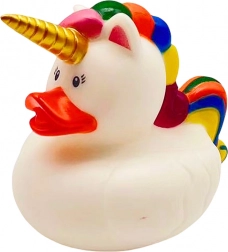 - Uniek design – wit eendje met regenboogmanen en -staart en een unicornhoorn valt meteen op.
