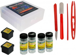 - Pincet, mesje, spatel, staafje, 7× objectglaasje, reageerbuisjes (totaal 4 stuks), doosje, kant‑en‑klaar preparaat