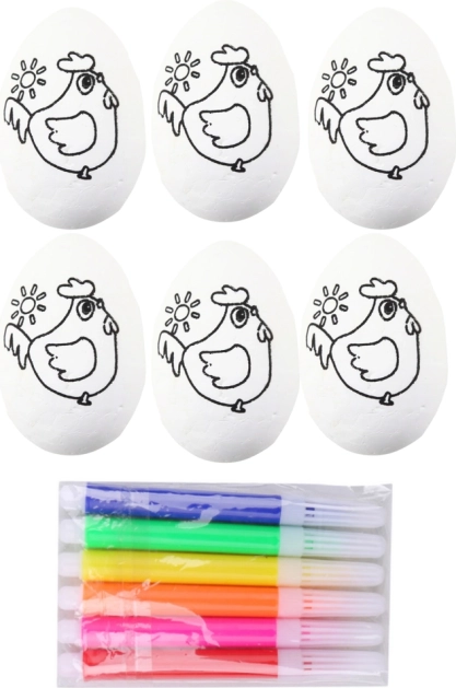 - Alles in de verpakking – 6 eieren + 6 kleurstiften (geel, oranje, rood, blauw, roze, groen).