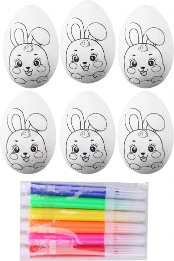 Creatieve set voor kinderen en volwassenen: 6 polystyreen eieren met een konijntjesmotief en gekleurde stiften voor eenvoudig decoreren. Ideaal voor paasdecoratie, eieren beschilderen en ontwikkeling van de fijne motoriek. De eieren hebben een glad oppervlak dat klaar is om te schilderen en te versieren, waardoor knutselen leuk, veilig en snel is.