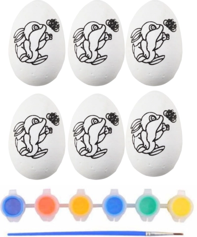 Polystyreen paas-eieren om te schilderen met konijntjesmotief. 6 stuks, verf en penseel inbegrepen. Creatief plezier voor kinderen, school en thuis.