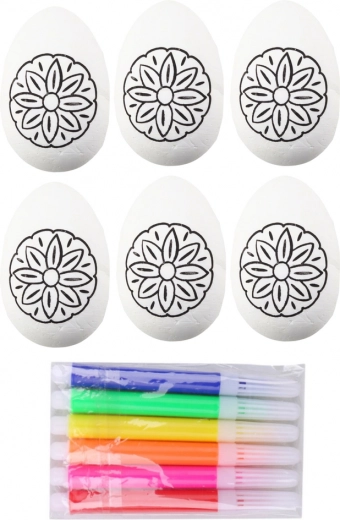 Creatieve set voor kinderen en volwassenen: 6 styropor eieren met bloemenpatroon en kleurrijke stiften voor eenvoudig versieren van paaseieren. Ideaal voor knutselen thuis, op school en in de kleuterklas. De eieren hebben een glad oppervlak, kleuren uitstekend en helpen fijne motoriek, creativiteit en plezier in het maken te ontwikkelen. Perfect als paasdecoratie en als cadeau.
