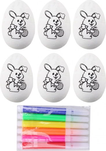 De set bevat 6 eieren en 6 gekleurde stiften – geel, oranje, rood, blauw, roze en groen – zodat je meteen aan de slag kunt. Knutselen bevordert de fijne motoriek, oog-handcoördinatie en kinderlijke fantasie.