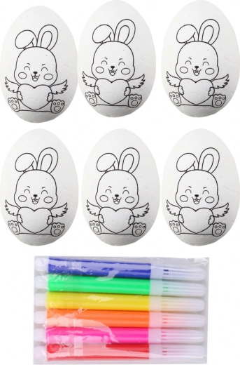 Creatieve set voor kinderen en volwassenen: 6 polystyreen eitjes met een schattig konijntjesmotief en kleurrijke stiften. Ideaal voor paascreaties, schoolprojecten en thuisplezier. Gladde oppervlakte voor eenvoudig schilderen, ontwikkeling van fijne motoriek en stimulering van de verbeelding bij het versieren van je eigen paasdecoraties.