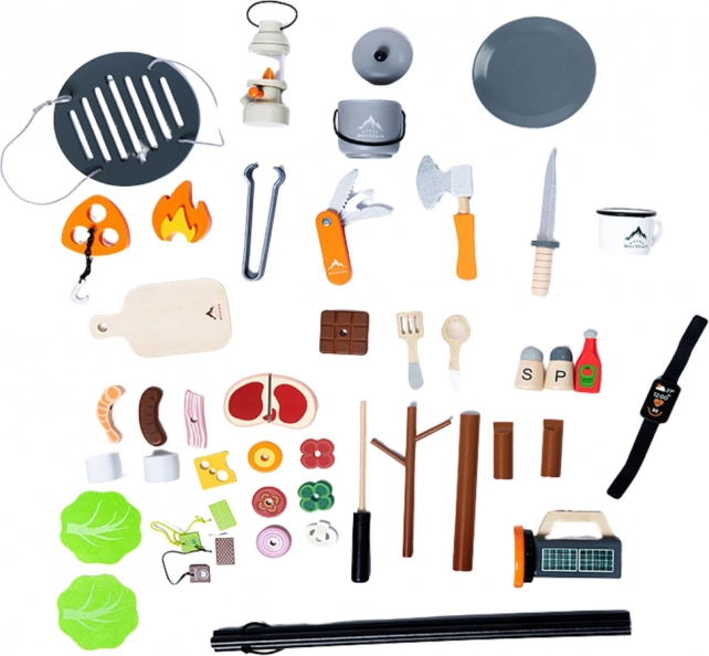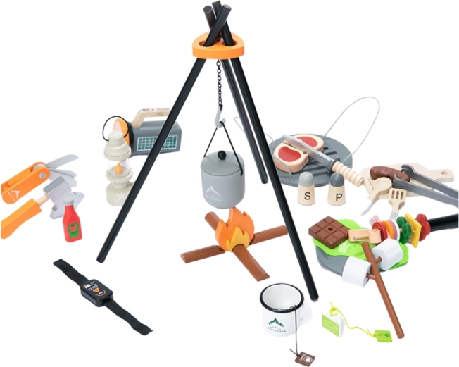 Met deze geweldige houten kampeerset beleven kinderen talloze avonturen, zowel thuis als buiten. Realistische accessoires bieden mogelijkheden om kamperen na te spelen, van een vuurtje maken tot eten bereiden. De set bevat een rugzak, lantaarn, barbecuetang en andere tools die de ontwikkeling van fijne motoriek en cognitieve vaardigheden stimuleren.