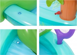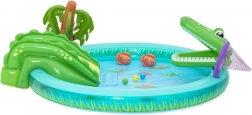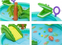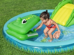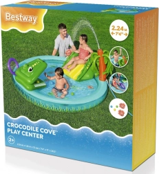 Geef kinderen een zomer vol vrolijkheid met het opblaasbare waterspeelcentrum in krokodillenstijl van BESTWAY. Deze set combineert een glijbaan met zachte landingszone, een sproeier in de vorm van een palmboom die op de tuinslang kan worden aangesloten en leuke activiteiten zoals balletjes in de bek van de krokodil gooien of visjes vangen. Het ruime badje met een inhoud van 210 l is ideaal voor kinderen vanaf 2 jaar en biedt veilige waterpret in de tuin.