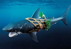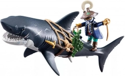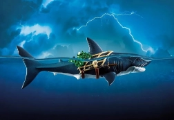 De reuzenhaai met piraat van PLAYMOBIL brengt kinderen spannende verhalen uit de diepte van de oceaan. Trek gewoon aan de hendel en de gigantische bek opent, klaar om prooi te “vangen”; laat los en hij sluit automatisch. De piratenfiguur houdt zich vast aan het net, is uitgerust met een sabel en dolken en is klaar voor elk zeegevecht.