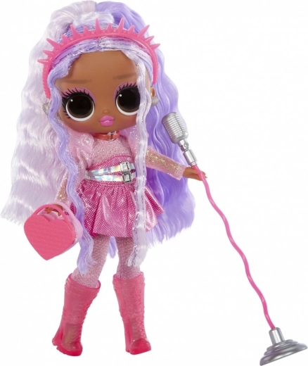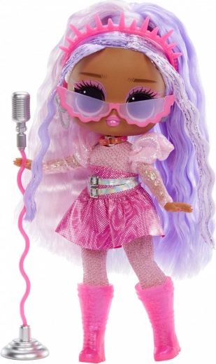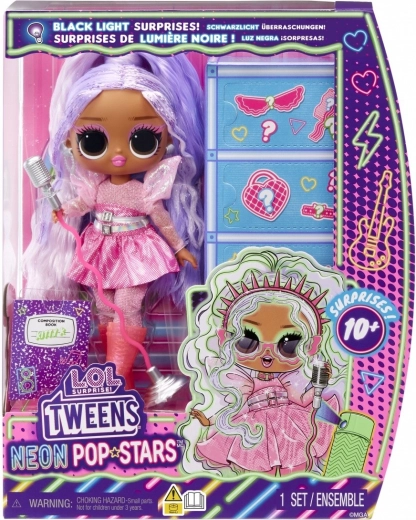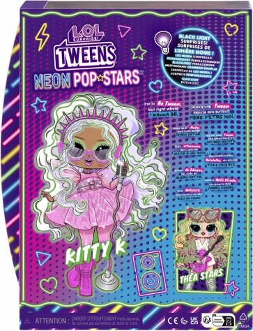 Betreed het podium met Kitty K uit de serie L.O.L. Surprise! Tweens Neon Pop Stars – een modieuze pop geïnspireerd op de popscene. Kinderen zullen haar uitgesproken look, lange paars‑roze haren en glinsterende outfit geweldig vinden, die je kunt combineren met een rijke set accessoires. Dankzij blacklight-verrassingen onthult UV-licht extra effecten en motieven die het spel naar een hoger niveau tillen.