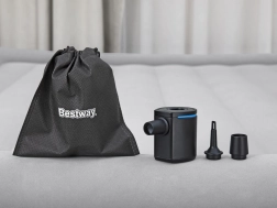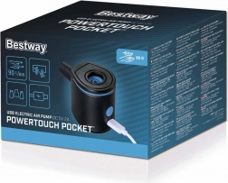 Compacte en lichte USB elektrische pomp BESTWAY POWERTOUCH POCKET voor snel opblazen en leegzuigen van matrassen, kampeermatten en zwembad speelgoed. Dankzij de luchtstroom van 90 l/min, eenvoudige bediening met één knop en ultralichte constructie (68 g) is hij ideaal voor reizen en kamperen. In de verpakking vind je 3 universele opzetstukken en een USB-kabel.