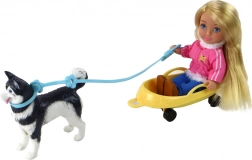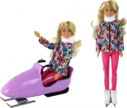 - Hoofdpop ANLILY, kleine pop, huskyhond aan de lijn, gele slee/kar, paarse sneeuwscooter, schaatsen, 2 helmen, sneeuwman, kleine accessoires