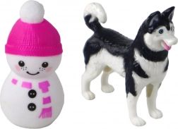 De set bevat ook een kleine pop, een vrolijke sneeuwman, een huskyhond aan de lijn en een gele slee/kar voor de hond. Voor actieritten is er een gedetailleerde paarse sneeuwscooter met winterdesign. Twee helmen zorgen voor veilig spel en de accessoires ondersteunen de ontwikkeling van verbeelding en fijne motoriek.