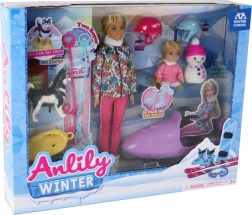 Ontdek de speelse wereld van winterse avonturen met de set Pop ANLILY wintersporten. De hoofdpop in een stijlvolle winteroutfit heeft bewegende gewrichten en witte schaatsen voor ijspret. Inclusief een kleine pop, een schattige huskyhond aan de lijn, een paarse sneeuwscooter, een slee en veiligheidshelmen. Ideaal voor creatief spel voor kinderen vanaf 3 jaar.