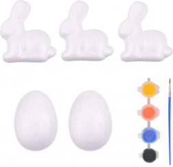 De set bevat drie polystyreen konijntjes en twee polystyreen eieren. Daarnaast zijn er vier intense kleuren en een penseel, waarmee gemakkelijk en nauwkeurig kan worden geschilderd.