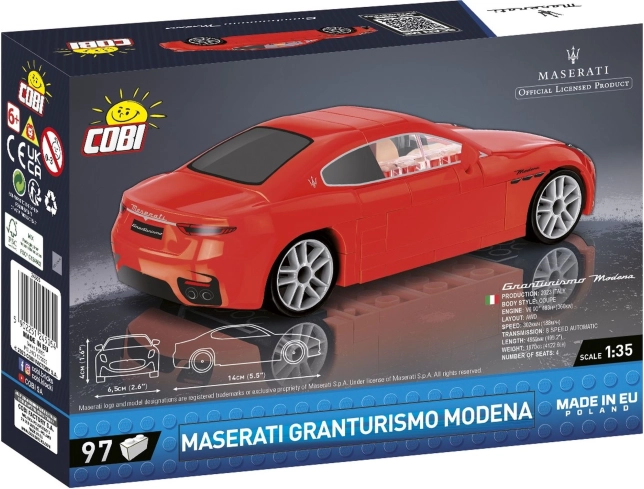 Geniet van het bouwen van een legende – MASERATI GranTurismo Modena. Deze hoogwaardige COBI-bouwset vangt trouw de lijnen van moderne Italiaanse elegantie en de sportieve ziel van de auto met de V6 Nettuno Twin Turbo-motor. Dankzij de compacte afmetingen op schaal 1:35 is hij perfect voor in een vitrinekast én voor speels bouwen.