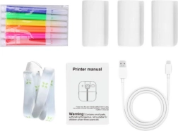 Camera, 3 rollen thermisch papier, USB-C oplader, draagkoord, 6 mini stiften en gebruikershandleiding.
