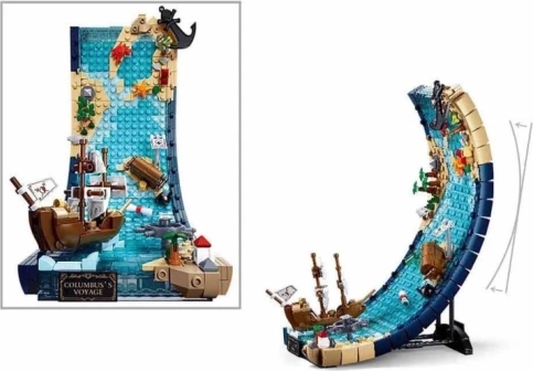 Deze design-bouwset brengt het iconische motief van de Columbusexpeditie tot leven in de vorm van een opvallende golf met zeilboot, een schat en maritieme elementen. Ideaal om te bouwen, te ontspannen en als stijlvolle decoratie op de plank.