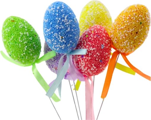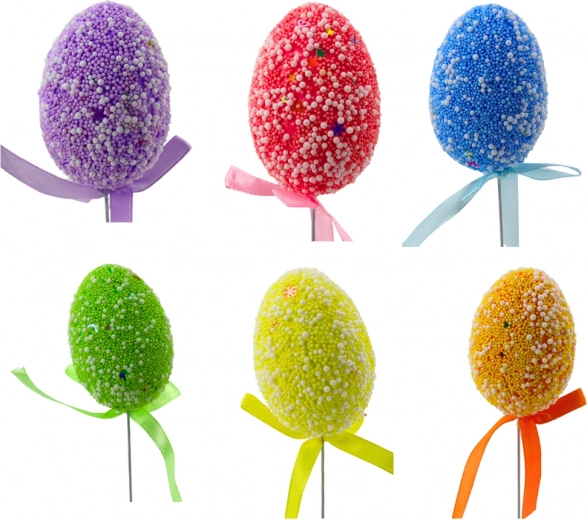 Kleurrijke paaseitjes op prikkers met een stijlvolle strik completeren prachtig de lentetafel, bloempotten en arrangementen. Lichte schuimeitjes met een getextureerd oppervlak van bolletjes en subtiele patronen ogen fris en speels, terwijl de flexibele draad een eenvoudige plaatsing in decoraties mogelijk maakt.