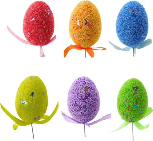 Breng je lentedecor tot leven met een elegante set van zes paaseitjes op steker. Elk eitje is versierd met kleine bolletjes en subtiele “nootjes” en afgewerkt met een bijpassend strikje. Dankzij de lichte styropor-decoratie, pasteltinten en de flexibele draad is schikken eenvoudig en effectief – ideaal voor boeketten, bloembakken, kransen en de feesttafel.
