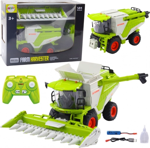 - RC-maaidorser met maiskop, afstandsbediening, accu 3,7 V 500 mAh, USB-lader, lospijp, waterreservoir voor rookeffect, originele verpakking