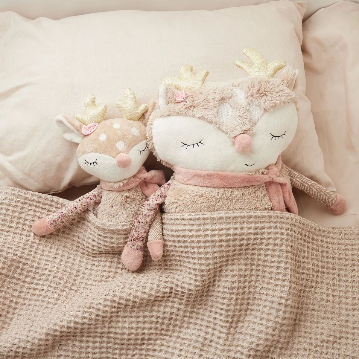 Maak kennis met hertenjong Ella – een zachte textiele knuffel die elke baby zal verrukken. De zachte, pluchen vacht geeft troost en een gevoel van veiligheid, terwijl de verschillende texturen de ontwikkeling van de tastzin en fijne motoriek ondersteunen. Ella is makkelijk vast te houden, fijn om te knuffelen en wordt al snel een favoriet onderdeel van het dagelijkse ritme en het avondlijke tot rust komen.