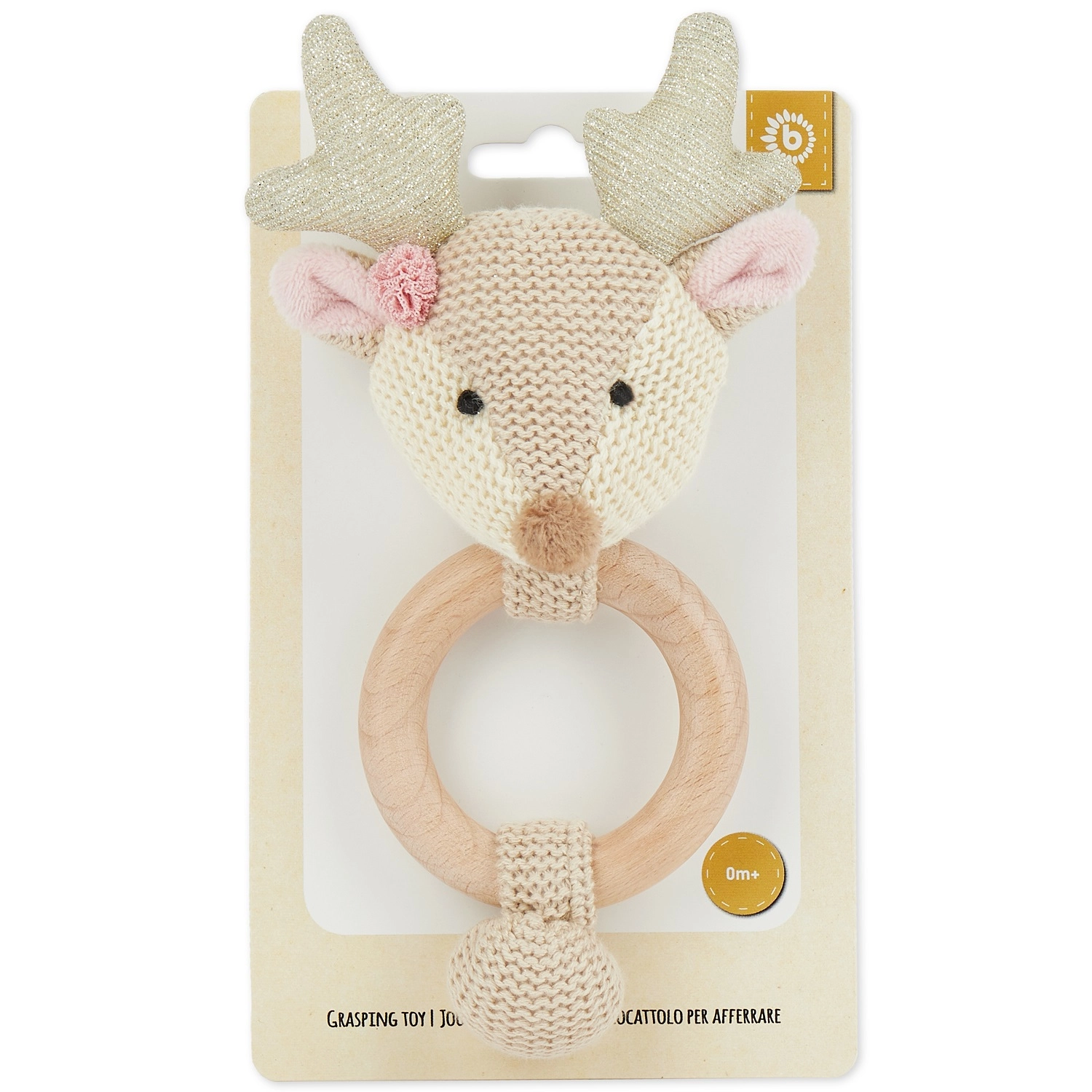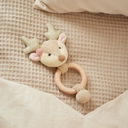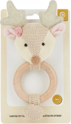 Het schattige hertje van Bieco combineert een rammelaar, grijpspeeltje en bijtring in één. Natuurlijk hout en zachte katoenen stof bieden een prettig contrast voor sensorische ontwikkeling, het zachte gerammel stimuleert het gehoor en de bijtring verlicht bij het doorkomen van de eerste tandjes.