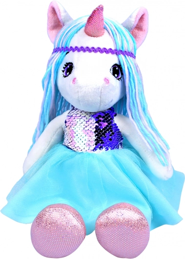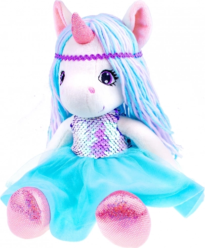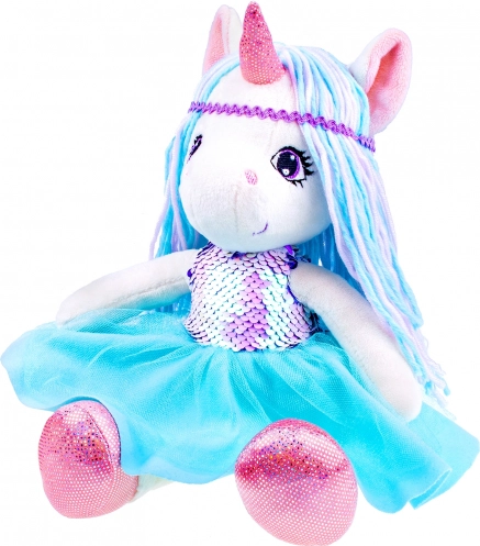 Zachte pluchen eenhoornpop 35 cm in blauw met pailletten en tule rokje. Ideaal om te knuffelen en voor fantasiespel. Een geweldig cadeau voor kinderen.