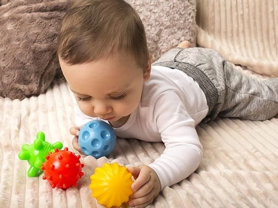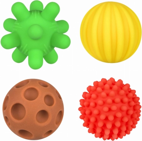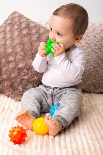 De ballen hebben verschillende texturen en heldere kleuren, wat de aandacht van kinderen trekt en helpt bij de ontwikkeling van de fijne motoriek en ruimtelijke oriëntatie: