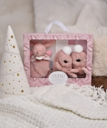 Schenk zachtheid en veiligheid met deze prachtige set. Het pluchen konijntje met een elegante strik geeft een gevoel van rust en stimuleert de zintuiglijke ontwikkeling van kinderen. Slofjes met lange oortjes houden de warmte vast dankzij het knusse materiaal en hebben een geborduurd konijnengezichtje op de voorkant.