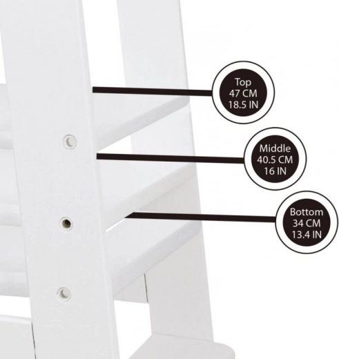 Ontdek de magie van deze witte leertoren, die is gemaakt van hoogwaardig multiplex met een maximale draagkracht van 50 kg. Door de verstelbare platformhoogtes van 34, 40,5 of 47 cm past hij zich perfect aan de groei en behoeften van het kind aan.