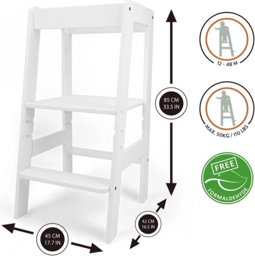 De toren is universeel ontworpen om bij de meeste keukenbladen of badkamerwastafels te passen en is gemaakt van materialen zonder formaldehyde. Ideaal voor kinderen van 18 tot 48 maanden.