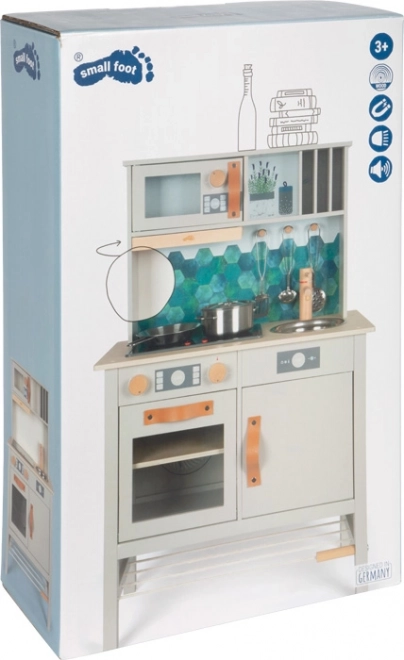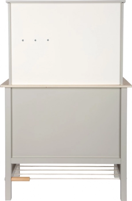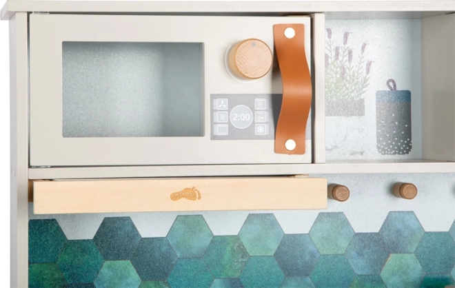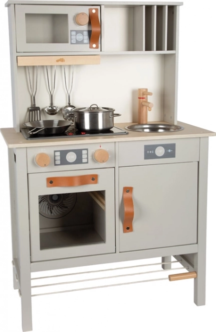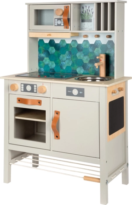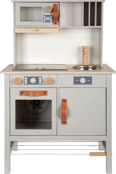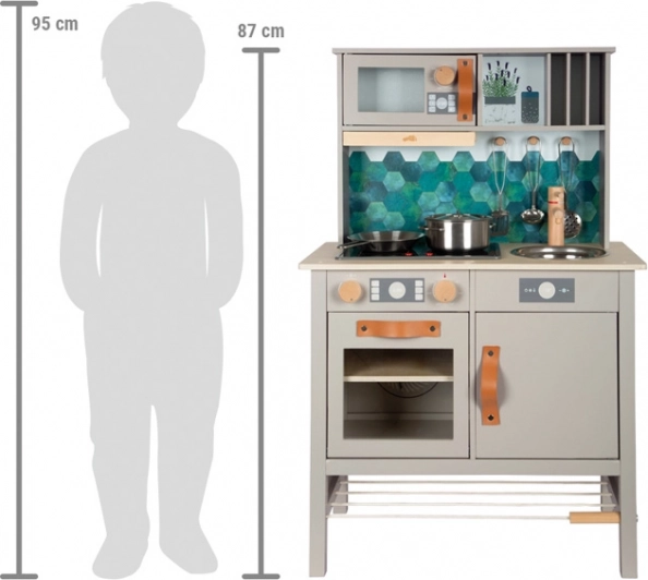 De stijlvolle en robuuste houten keuken Tasty in grijs biedt kinderen een realistische kookervaring. Een elektronische kookplaat met licht en geluid, een metalen spoelbak en draaiknoppen met klikgeluid versterken de authenticiteit, terwijl de uittrekbare afzuigkap met lichtsymbool een modern accent geeft. De binnenzijden van de oven en koelkast zijn bedrukt met keukendetails voor nog meer speelplezier.