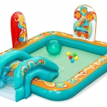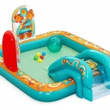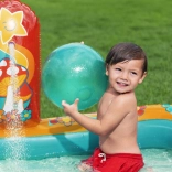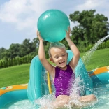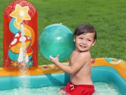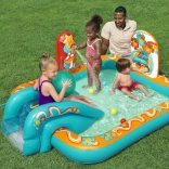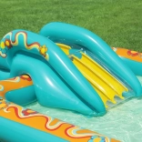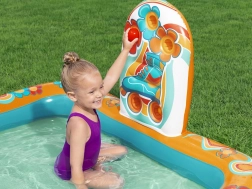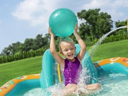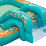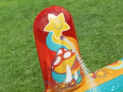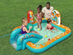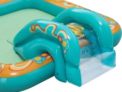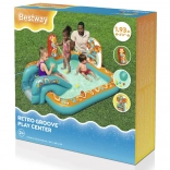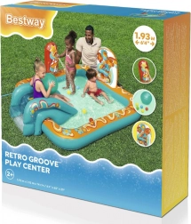 Het opblaasbare speelcentrum BESTWAY Retro Groove verandert je tuin in een kleurrijke waterspeelplaats. De stabiele glijbaan, stevig bevestigd aan de bodem, leidt naar een ondiep badje en voor verfrissing zorgt de watersproeier, die je eenvoudig op de slang aansluit. Retrographics en accessoires zoals balletjes en een strandbal stimuleren creatief spel en motorische ontwikkeling.