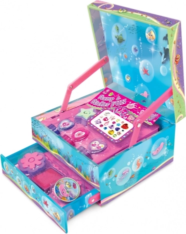Creatieve set voor kleine en grote makers: stempelset met zeemeerminmotief in een cadeau doos–juwelendoosje met een zelfopenende lade. Til simpelweg het deksel op en de lade schuift vanzelf naar voren – handig en leuk.