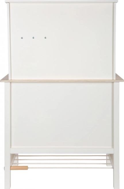 Stijlvolle kinderkeuken in het wit met cognackleurige handgrepen voor realistisch speelplezier. Voorzien van een elektronische kookplaat met licht en geluid, draaiknoppen met klikgeluid, metalen sp... Meer tonen