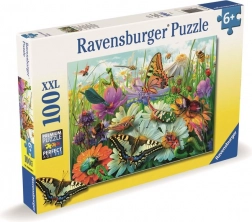 De puzzel bevat gedetailleerde illustraties van verschillende insectensoorten, omgeven door kleurrijke bloemen, wat een prachtig beeld geeft van biodiversiteit.